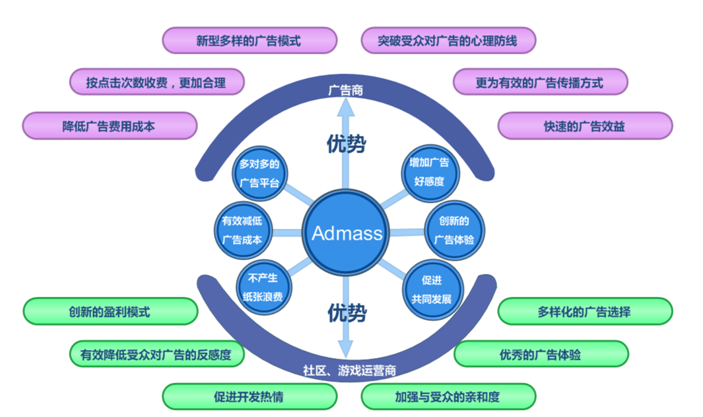 Admass是一个以社区植入式广告与Social game植入式广告为主要运营方向的新型广告平台。主要做的是为商家寻找适合的植入式广告,同时为社区和游戏运营商寻找合适的游戏广告植入素材。Admass平台通过提供商家一种新型的广告宣传方式,以及提供社区和游戏运营商一个全新的展现平台,主张将商家品牌植入到社区和Social game中,以此吸引消费者的注意。这一切由品牌虚拟游戏开始。