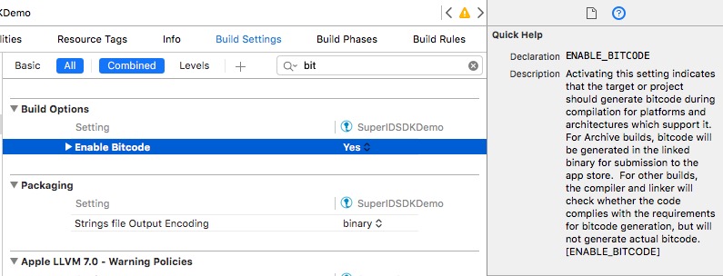 实际上在Xcode 7中,我们新建一个iOS程序时,bitcode 选项默认是设置为YES的。我们可以在 Build Settings -> Enable Bitcode 选项中看到这个设置。如下图所示: